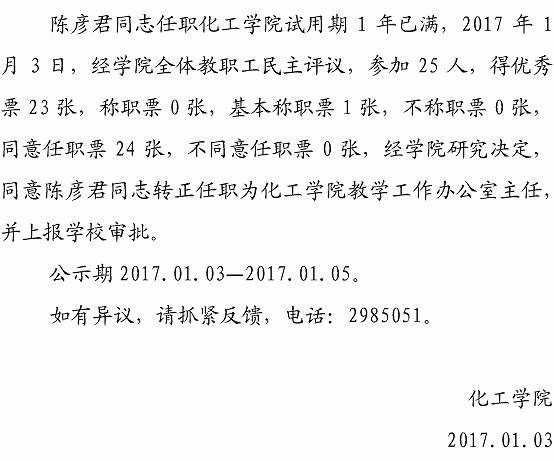 关于陈彦君同志试用期结束williamhill英国威廉希尔同意其转正的公示