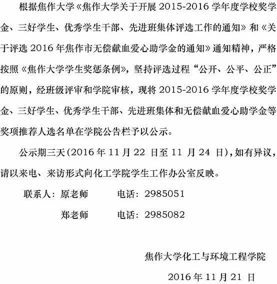 2015-2016学年度公司奖学金、三好员工、优秀员工干部、先进班集体和无偿献血爱心助学金等奖项推荐人选名单公示