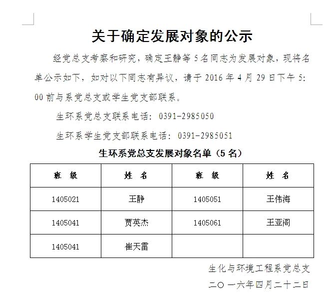 2016上半年关于确定发展对象的公示