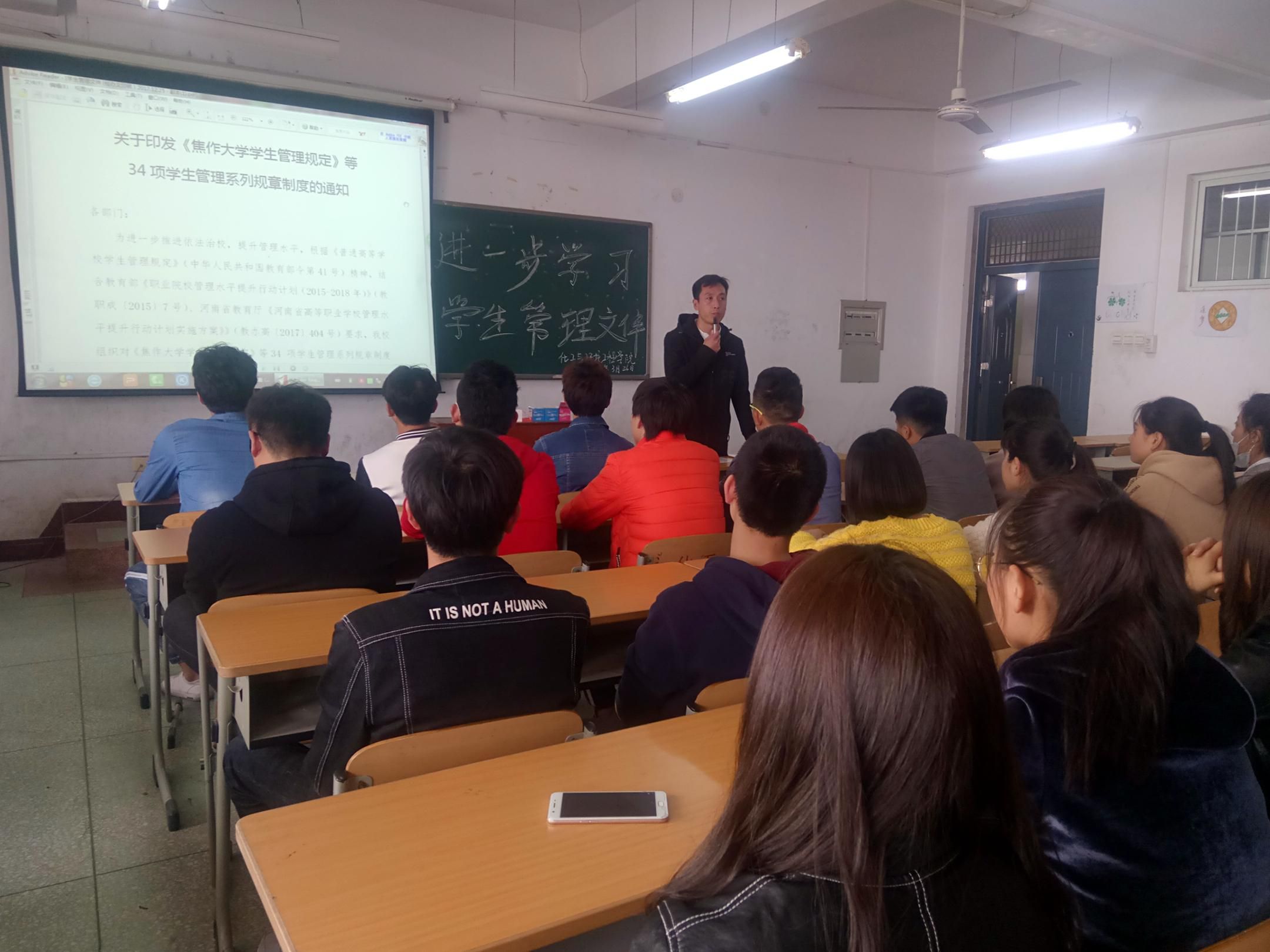 2018年3月26日,按照williamhill官方网站关于在员工中开展《williamhill官方网站员工管理规定》学习教育的要求,williamhill英国威廉希尔在二教楼601教室召开学习员工管理规章制度主题班会,辅导员燕兴海、董蒙蒙两位老师主持了班会。