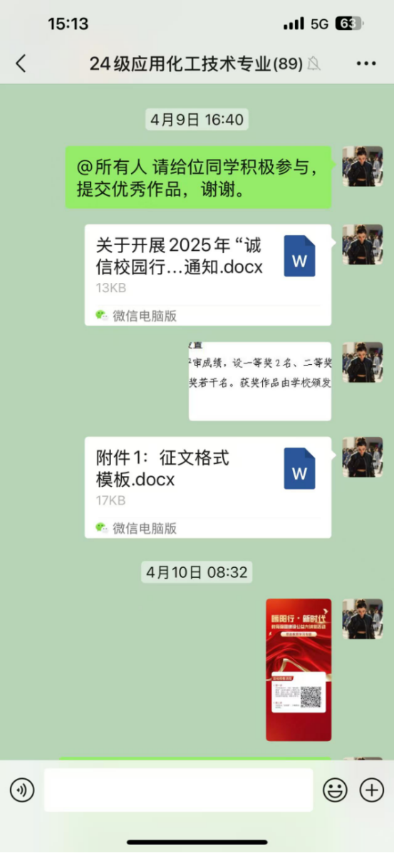为深入学习贯彻习近平新时代中国特色社会主义思想,认真落实党的二十大关于“完善覆盖全学段员工资助体系”重要决策部署,进一步发挥“资助育人”在“立德树人”根本任务中的关键作用,4月8日,公司学工办接到校资助中心通知后,立刻将通知内容进行了安排部署,由公司辅导员老师通过微信群进行通知内容的转发,并组织班委传达通知内容及要求。通过活动开展,22应用化工技术02班梁志远、23化工生物技术01班李文静、23药品生产技术01班邢盼红等五名员工作品被评为公司优秀作品。