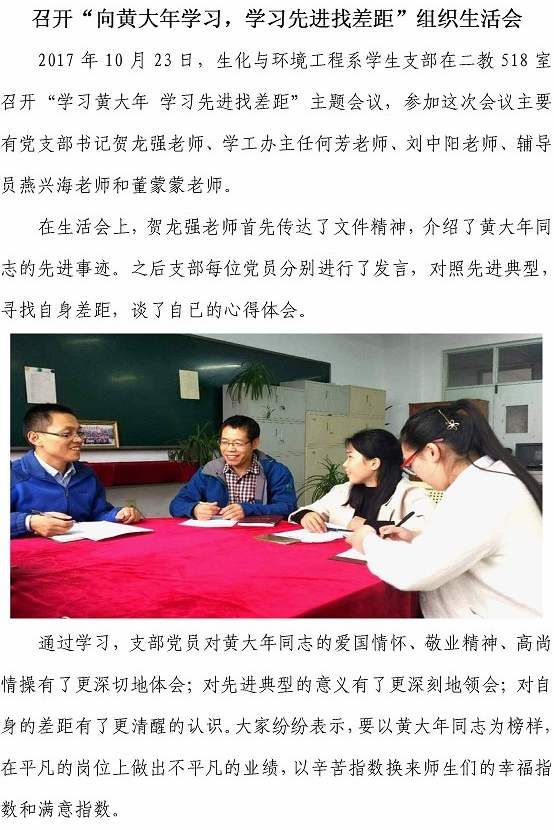 生化与环境工程系员工支部召开“向黄大年学习,学习先进找差距”组织生活会